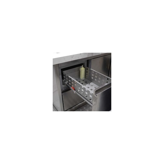 - Cajones con tirador incorporado en acero inoxidable, con fondo perforado. Provistos de guías telescópicas con salida suficiente para salvar el plano de trabajo.